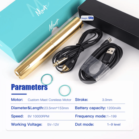 The Dragonhawk Mast Tour Y22 Wireless pen machine is the perfect cordless, lightweight option for your PMU treatments. Created with a Custom Mast Coreless motor, this machine provides maximum freedom for artists who want to work without the restrictions of cords and wires.